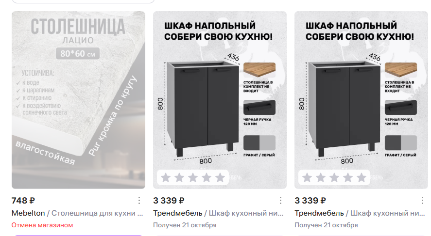 Столешница же зависла где-то на сортировочном центре, в результате чего была просто не доставлена, может быть утеряна. Я ещё чуток просчиталась, оплатив заранее покупку, поэтому пришлось ждать. Сейчас деньги упали обратно на мой счёт ВБ, и я уже оформила заказ на новую столешницу.