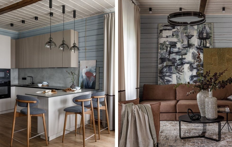 Рельефные поверхности мебели, узор ковра и кухонного фартука создают эффекты, перекликающиеся со стихией воды — рябью и бликами на озере Место: Уфа Тип дома: дом из бруса Метраж: 147 кв. м Год реализации: 2025 Этажи: 2 Комнаты: 5 Cанузлы: 2 Высота потолков: 3,15 м Бюджет: 8 млн рублей Дизайн: Лариса Байракова Стилист: Кристина Сальникова Фото: Роман Спиридонов Этот дом, расположенный вблизи Павловского водохранилища в пригороде Уфы, был построен большой и дружной семьей на месте их старого жилья. Заказчики стремились максимально интегрировать прекрасные виды за окном в интерьер, создав экологичный загородный дом, который одновременно отвечал бы всем требованиям современной жизни. Понимая, что без специализированных знаний и опыта сложно добиться желаемой атмосферы, и тем более в сжатые сроки, супруги пригласили профессионального дизайнера Ларису Байракову. Новый дом задумывался как двухэтажный с просторным мансардным этажом. Заказчики пожелали выделить отдельную приватную зону, поэтому