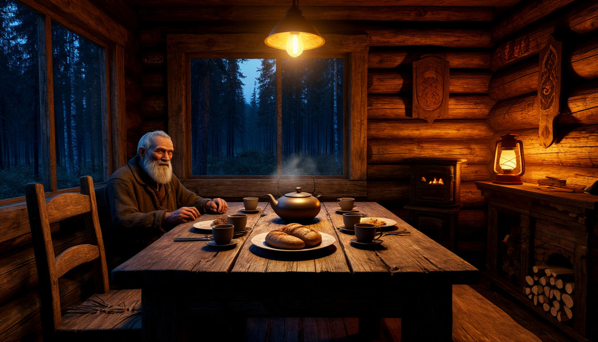 Посреди поляны стоит избушка. Маленькая, деревянная, старая но крепкая. Брёвна потемневшие, крыша из досок, труба каменная. И самое странное — в окне горит свет. Тусклый, жёлтый, как от керосиновой лампы.