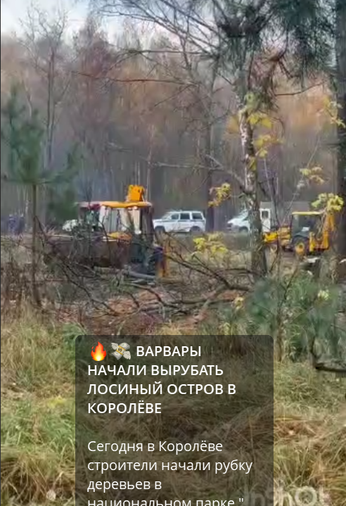 30.10.25 По сообщению Левого фронта (Королев) начались активные вырубки в национальном парке «Лосиный остров» (в районе ул. Мичурина). Полиция и Росгвардия, охраняющие работы, отвечают возмущенным жителям Королёва, что все законно, что есть порубочные билеты. Но этих порубочных билетов «вживую» не показали никому. Отметим, что «официально» строители не прокладывают новую дорогу, а ремонтируют старую, но никаких старых дорог в этом районе нет. Зато есть канал, снабжающий водой Москву. 29.10.2025 пресс-служба Сергея Обухова (депутат Госдумы от КПРФ) сообщила о том, что КПРФ подняла в Госдуме вопрос о возврате контроля над «Лосиным островом» федеральным властям. «По мнению коммунистов, передача полномочий мэрии Москвы открыла дорогу для хозяйственного освоения парка и превращения его в прибыльный, но лишенный заповедной ценности объект. …Коммунисты уверены, что «Лосиный остров» нуждается в особой защите, которую не могут обеспечить столичные власти. Они привели целый ряд примеров, когда д