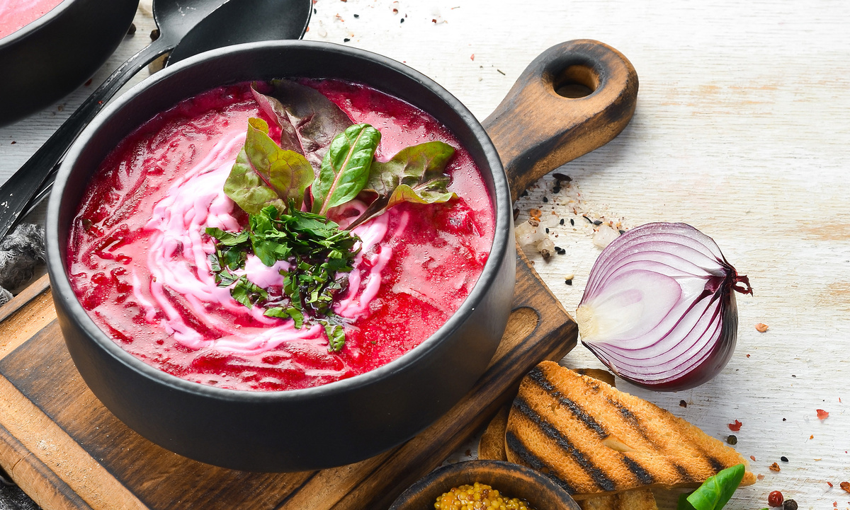 В глубоких тарелках: налей холодный свекольник, добавь огурцы, редис, яйцо, посыпь зеленью, положи ложку сметаны. Освежающий, слегка кисловатый, ярко-бордовый суп с хрустящими овощами и нежной сметаной. Идеален в жару — как натуральный кондиционер в тарелке.
