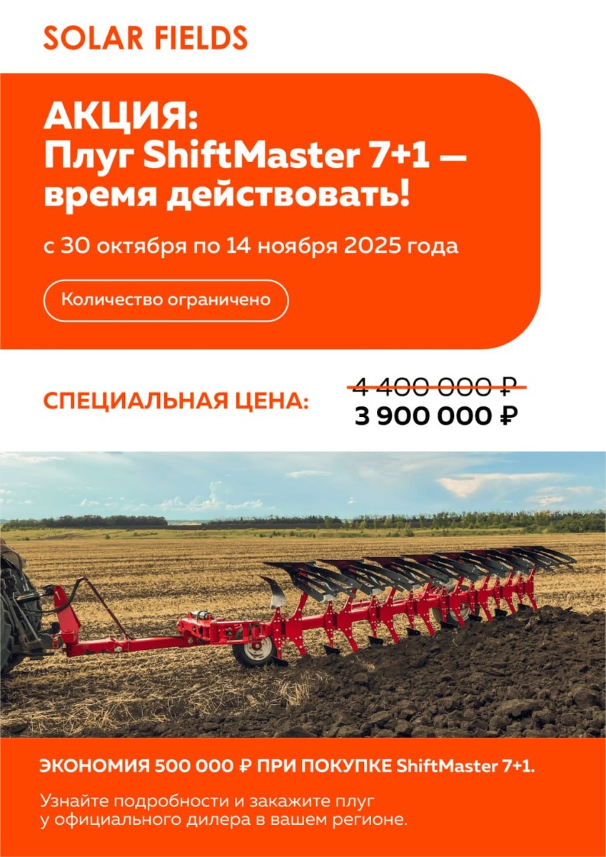 🔥🔥🔥🔥: оборотный плуг ShiftMaster 7+1 — время действовать! С 3⃣0⃣ октября по1️⃣4⃣ ноября 2025 действует спецпредложение. 💰Специальная цена: 4 400 000 ₽ → 3 900 000 ₽ Выгода: 500 000 ₽. Количество ограничено. ❔Почему ShiftMaster 7+1: ✔️ Глубокая вспашка до 30 см ✔️ Усиленная рама 160×160×12 мм из легированной стали — держит экстремальные нагрузки. ✔️ Корпуса и рабочие органы из борированной стали — стабильное качество обработки. ✔️ Регулируемая ширина захвата: 33 / 38 / 44 / 50 см. ✔️ Гидравлический оборот без биения — точность на каждом развороте. ✔️Опорное колесо снижает давление на почву и точно держит глубину. Посмотрите «до/после» — такой след хочет видеть каждый агроном. ☎️ Узнайте детали и оформите заказ у официального дилера в вашем регионе.