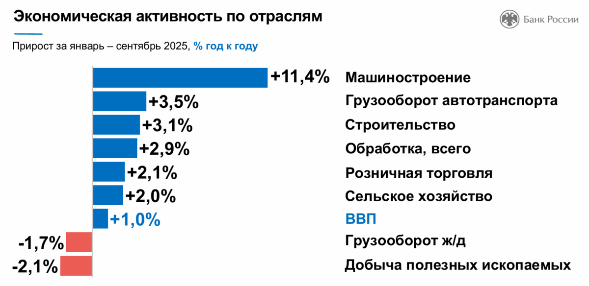 Далее вызывает смущение то, что, как показано на слайде, все отрасли в основном растут на 2% и выше, а ВВП почему-то оказывается всего 1%.