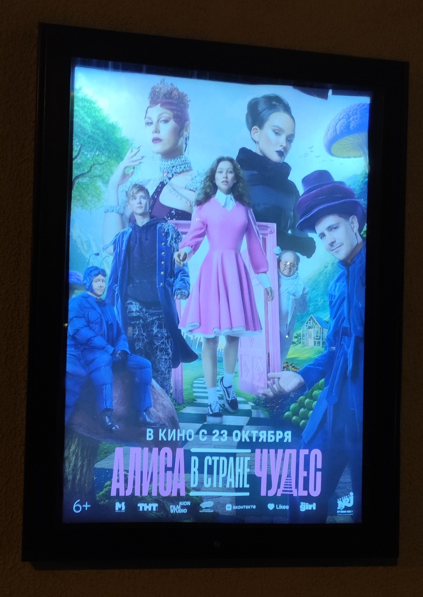 Не успел фильм выйти в прокат, как интернет стал полниться отзывами о нем. Поначалу я держалась в стороне, а потом решила: "Почему бы и мне не посмотреть, составить свое представление". Я лояльно отношусь к современным отечественным фильмам. Из последнего смотрела "Кракен" (2025) и "Летучий корабль" (2024) - оба понравились. Хоть и песни в Летучем корабле мне больше из мультика нравятся. Раньше я любила ходить на утренние сеансы и, окунувшись в эти приятные воспоминания, с предвкушением приятной атмосферы просмотра кино, принялась выбирать кинотеатр. В этом кинотеатре я была первый раз. Он оказался очень необычным - во-первых, еще советский, думаю. Во-вторых, он находится в жилом доме. В-третьих, он похоже еще и детский. Но и для тех, кто постарше, фильмы там тоже крутят, как я поняла из афиш. Еще афиша. И еще афиша: И даже звонок раздается перед началом фильма! Панорамный вид на кинотеатр. Точно не могу отнести себя к тем, кто фильм критикует. Как по мне, и на фоне разных других на