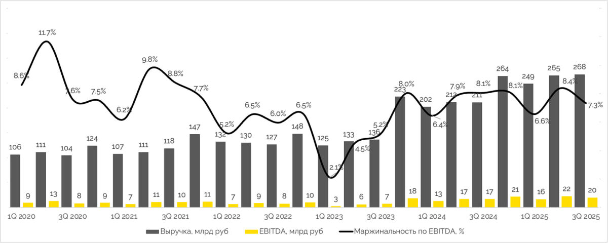 Один из важных показателей для этого сектора ритейла — маржинальность по EBITDA. Она чуть снизилась с 7,5% до 7,4%.
