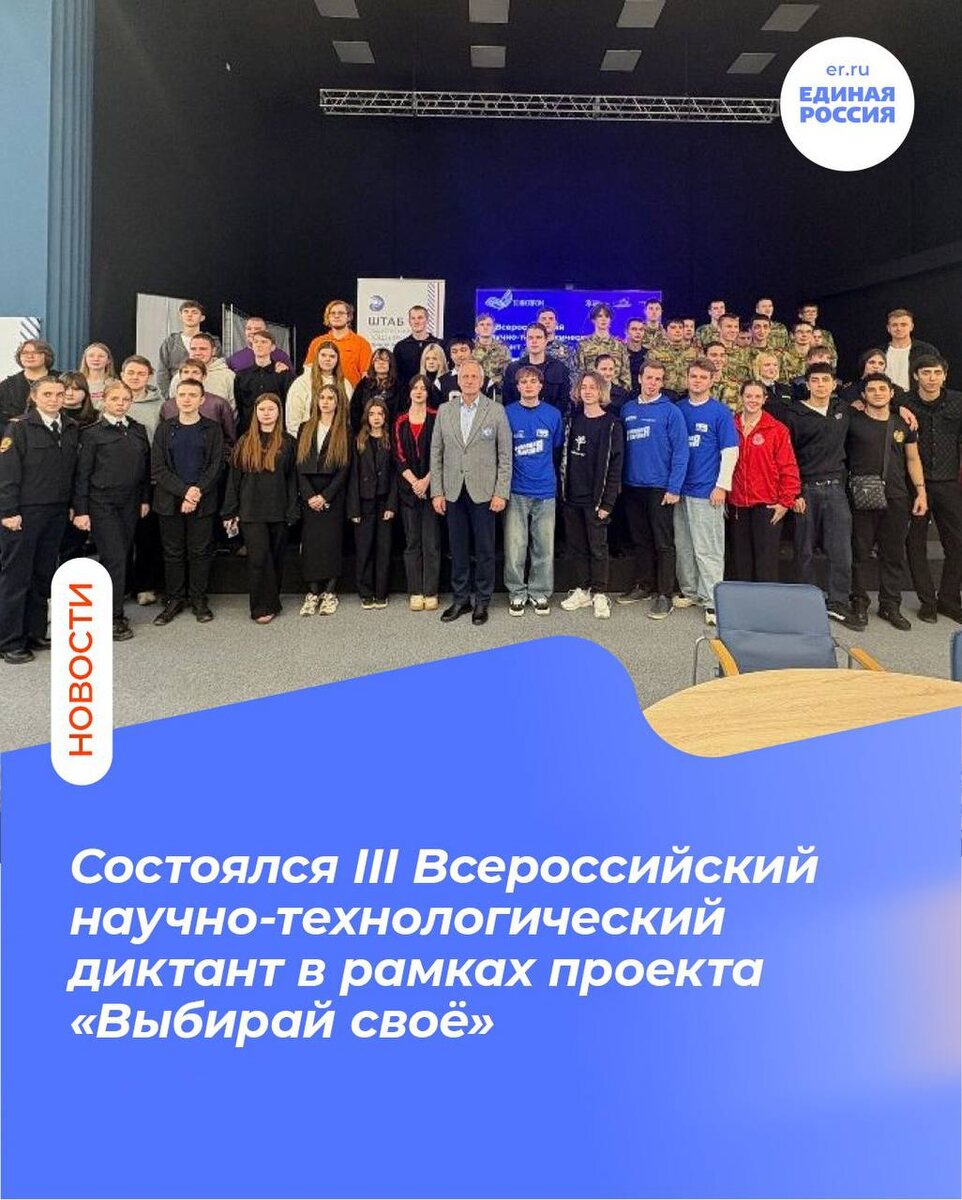 ▪️В Калужской области состоялся III Всероссийский научно-технологический диктант в рамках федерального партийного проекта «Выбирай своё». Он прошел на площадке Штаба общественной поддержки партии «Единая Россия» по теме: «Технологии победы». «В год 80-летия Великой Победы тема диктанта «Технологии победы». И самое главное, чтобы все мы в ближайшем будущем взялись за технологический приоритет нашей страны – его надо двигать вперед, развивать, заниматься наукой, чтобы Россия осталась великой технологической державой», - поприветствовал участников депутат Законодательного Собрания Калужской области Андрей Литвинов и вместе со всеми написал диктант. Студенты Калужского кадетского многопрофильного техникума имени А.Т. Карпова, юридического полицейского колледжа, Среднерусского колледжа управления и бизнеса, а также из Калужского филиала РАНХиГС, КГУ имени К.Э. Циолковского и представители «Молодой гвардии Единой России» приняли участие в проверке своих знаний о технологиях в годы ВОВ #ЕР
