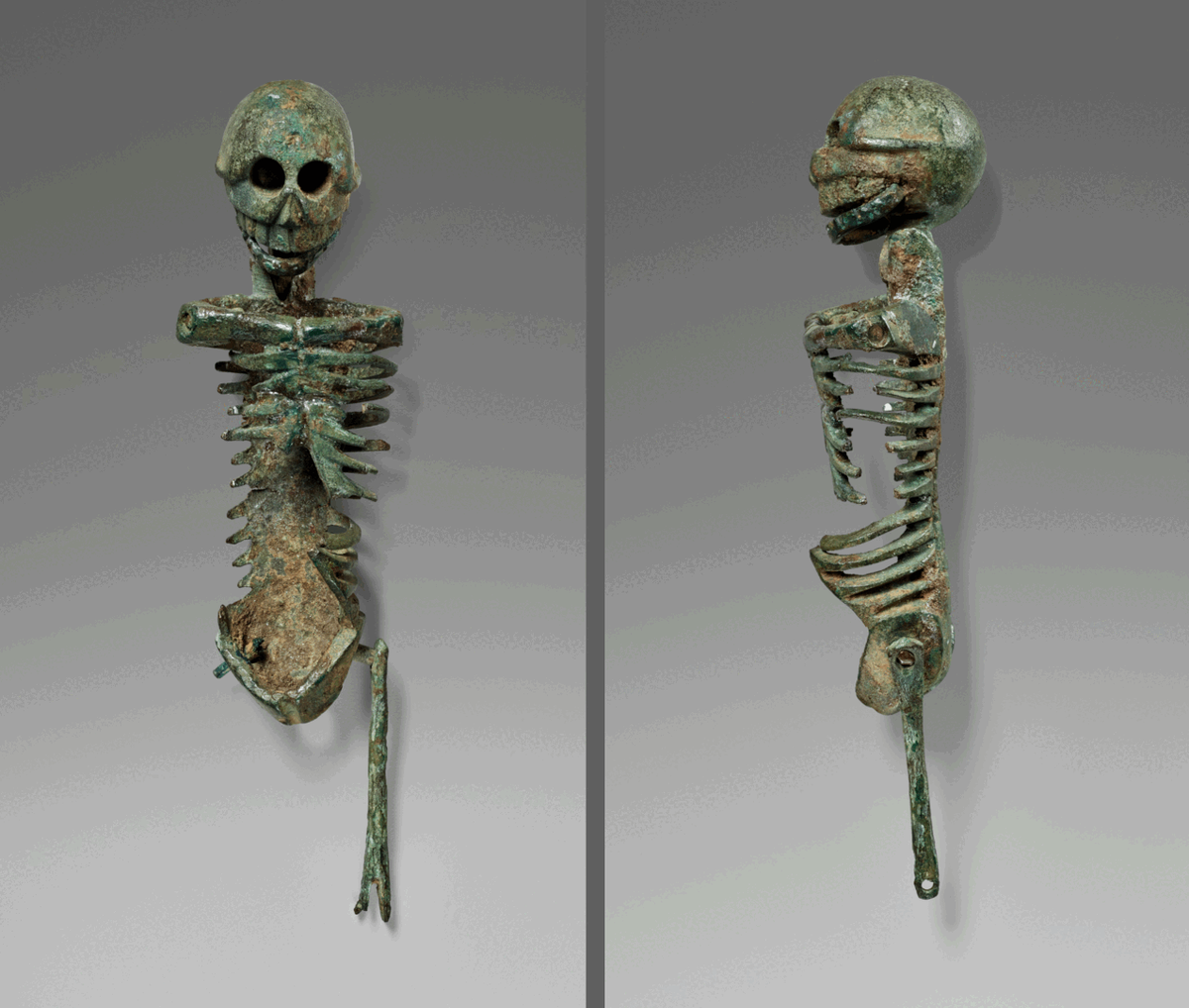 Хотя римляне не праздновали Хэллоуин, их пиры украшали жутковатые игрушки вроде вот этого бронзового скелета. С подвижными руками, ногами и головой на шарнирах, он должен был напоминать пирующим, что жизнь коротка. Такие игрушки называли larva convivalis – «пиршественный призрак». Скелетик высотой всего около 7 см, у него большие глазницы и широкая улыбка. Изготовленный в I веке нашей эры, сейчас он выглядит спокойным, потому что потерял конечности – осталась только верхняя часть одной ноги. Но когда-то он мог танцевать и дёргаться, напоминая владельцу о краткости человеческой жизни и необходимости извлекать пользу из оставшегося времени. Сейчас находка хранится в музее Джетти в Лос-Анджелесе. Известны еще 10 подобных диковинок: один скелет из серебра, найденный в Помпеях, один деревянный, остальные из бронзы. Вообще римляне любили изображать скелеты, которые встречаются в мозаиках, на лампах, чашах и кубках, гравированных драгоценных камнях. На одной из гемм мы видим человека с молотк