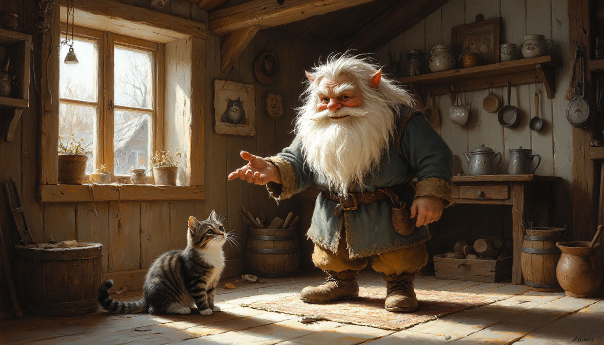 В старом доме под черепичной крышей, пахнущем яблоками и воском, время текло медленно и плавно, как мёд. Пылинки танцевали в солнечных лучах, пробивавшихся сквозь кружевные занавески, а по вечерам бродившие по скрипучему паркету тени казались не тенями, а воспоминаниями, застывшими в воздухе. Хранителем этого неторопливого ритма был домовой, которого звали Самсон. Он был стар, как сам дом, и мудр, как время. Его лохматая фигура, невидимая для обычного глаза, часами могла неподвижно сидеть на своей любимой полке за русской печкой, наблюдая за жизнью дома, как зритель наблюдает за давно знакомым спектаклем.