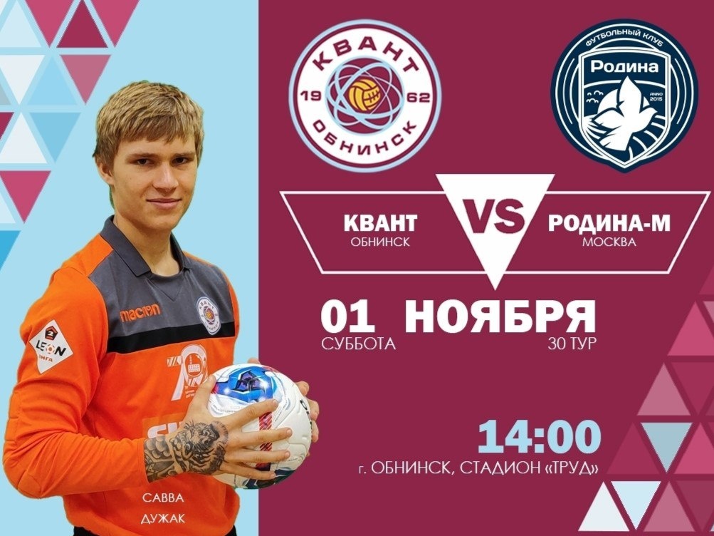 ⚽1 ноября в 14:00 на стадионе «Труд» в Обнинске пройдёт футбольный матч ФК «Квант» (Обнинск) и ФК «Родина-М» (Москва