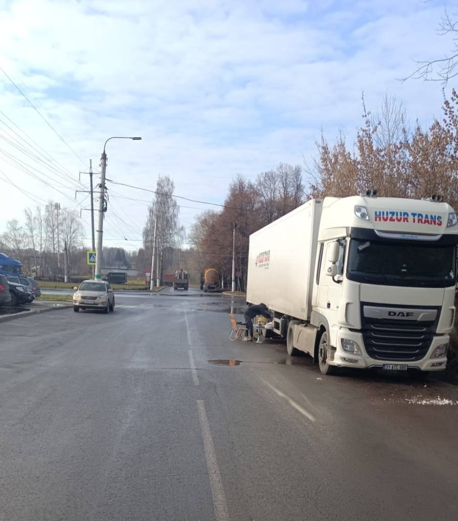 Водитель грузовика с иностранными номерами решил устроить обеденный перерыв с кальяном прямо на проезжей части в промзоне
