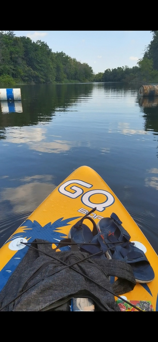 Прислонил его к дереву, и поднялся ещё раз на третий этаж - за веслом, лишем и плавником. Река Цна находится прямо за моим домом, и дойдя до пляжа, я вставил плавник в свое место. Аккуратно положил сап на воду, сел на него сам и поплыл...