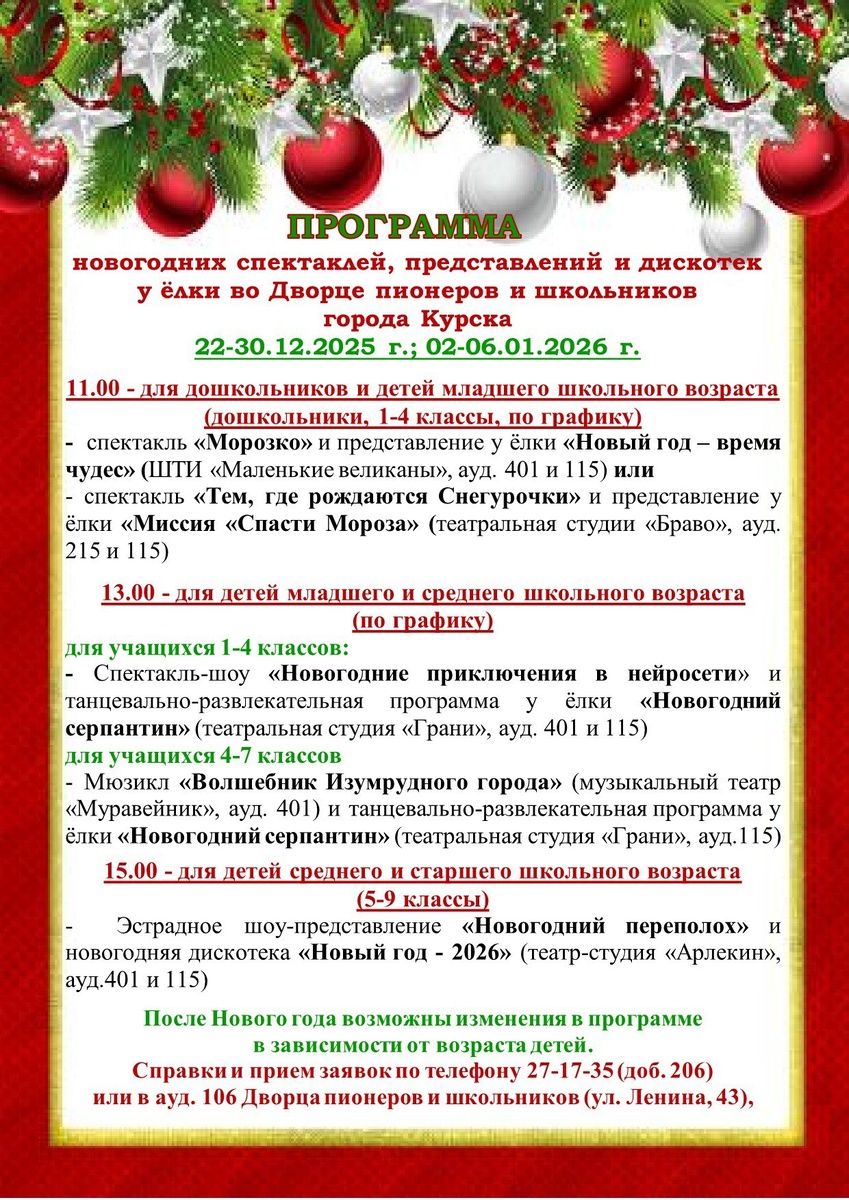 ПРОГРАММА новогодних спектаклей, представлений и дискотек у ёлки во Дворце пионеров и школьников города Курска 22-30.12.2025 г