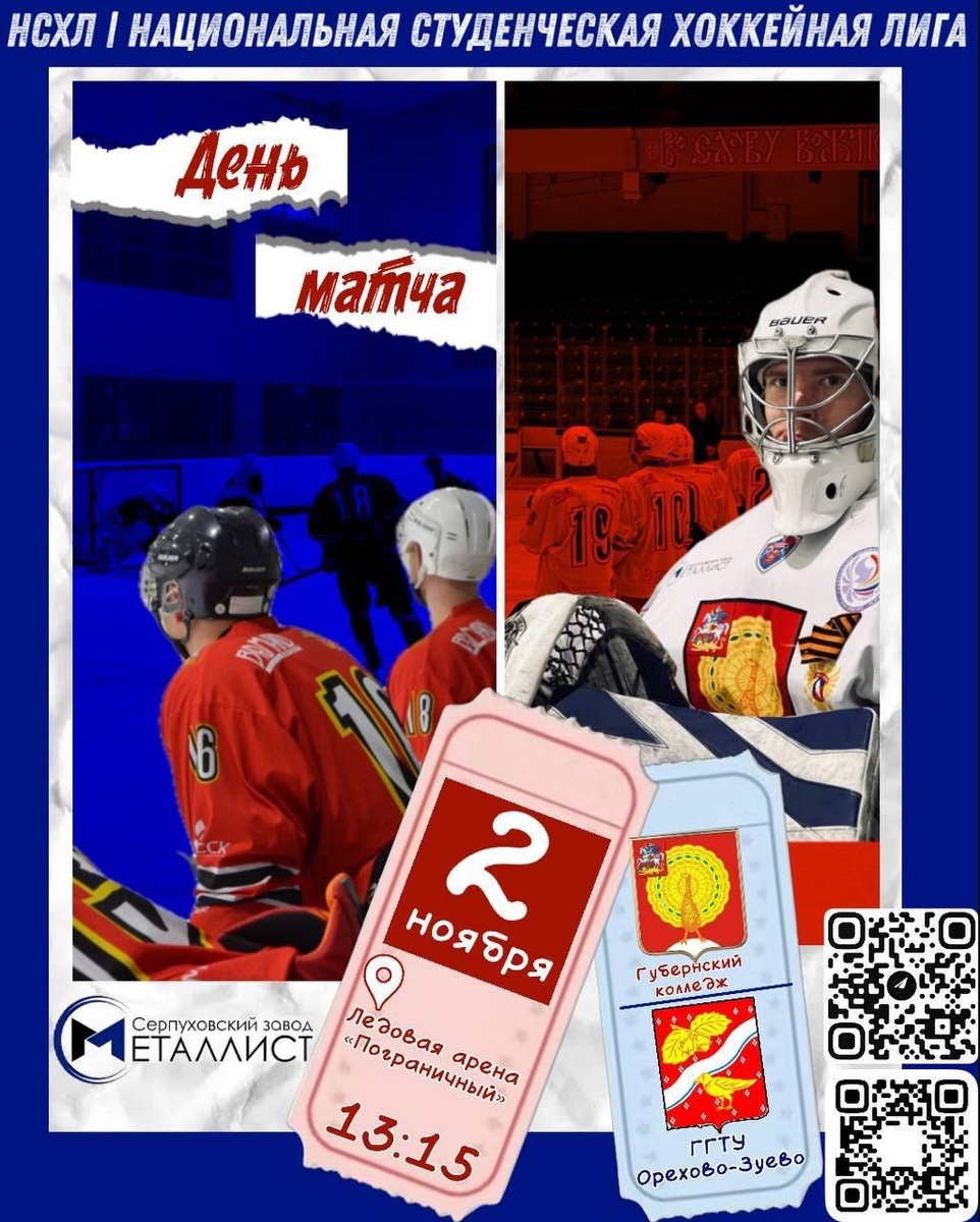 ✨ 📆Дорогие болельщики, в это воскресенье, 2 ноября в 13.15 приглашаем вас на хоккейный матч 🏒 На льду встретятся команды "Губернский колледж" Серпухов и «ГГТУ Орехово-Зуево»! Приходите поддержать ребят!👏 📍Ждём Вас на нашей Ледовой арене по адресу: Поселок Пограничный, 4В 🎫Вход бесплатный 🏢 Ледовая арена "Звезда" 📍 г. Серпухов, Московское ш., 55, к 1 💰 Вход свободный❗️ ⭐Поддержать канал голосом 💰 Вакансия - курьер в Серпухове ✅ Мероприятия Серпухов https://dzen.ru/id/66f01c6eb4c6fe60c9ca1608 http://vk.com/serpukhov_events http://dzen.ru/serpukhov_events