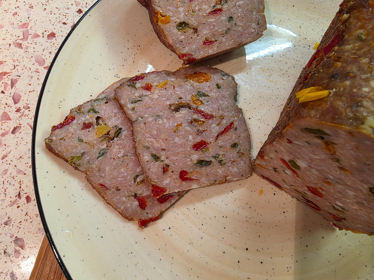 ✅МЯСНОЙ ХЛЕБ (без нитритной соли) Этот рецепт мы с вами приготовим без нитритной соли, но по колбасной технологии. Это означает, что мы будем прогревать хлеб в духовке при температуре не более 100 градусов до 70 градусов внутри. Это обеспечит нам сочность нашего мясного хлеба. 📖Немного истории. Мясной хлеб был придуман мясниками, которым приходилось в угоду клиентов обрезать разные некрасивые кусочки мяса и жира. В результате к концу дня у них оставалось большое количество обрезком, которые уже никому нельзя продать. Тогда они придумали мясной хлеб. Из этого понятно, что мясной хлеб должен быть сам по себе не дорогим по себестоимости и может производиться из любого мяса. Мы сделаем с вами сегодня из свинины, а чуть позже я покажу и другие варианты. Нам понадобится: свинина (лопатка) - 1 кг соль поварена - 20 г кориандр - 2 г копченая паприка - 2 г перец молотый - 2 г перец сладки разных цветов - 200 г вода -100г Перец порезать на кубики и обжарить. Будет наряднее и ярче, если воз