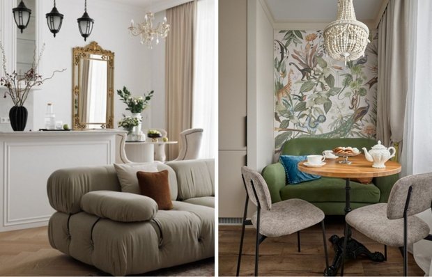 Вдохновляйтесь и берите на заметку! Кухня-гостиная — это не просто функциональное пространство, но и центр семейной жизни, место для встреч с друзьями и уютных вечеров. Правильное оформление этой зоны может значительно улучшить ее атмосферу и сделать обустройство более гармоничным. Показываем несколько интересных и красивых решений, которые были реализованы в проектах наших героев. В этой двушке изменили планировку, объединив кухню и гостиную в одно пространство. Теперь комната кажется больше и светлее. Для разделения зон дизайнер использовала кухонный остров, который помогает обозначить границы и выполняет несколько функций. Остров подходит не только для готовки, но и как дополнительное место для обедов или общения. Он может служить местом для хранения, а также для быстрых завтраков или мероприятий с друзьями, что делает жизнь в квартире еще более комфортной. В объединенной кухне-гостиной семьи Надежды всё продумано до мелочей: фасады с филенками сочетаются с молдингами на стенах, бар