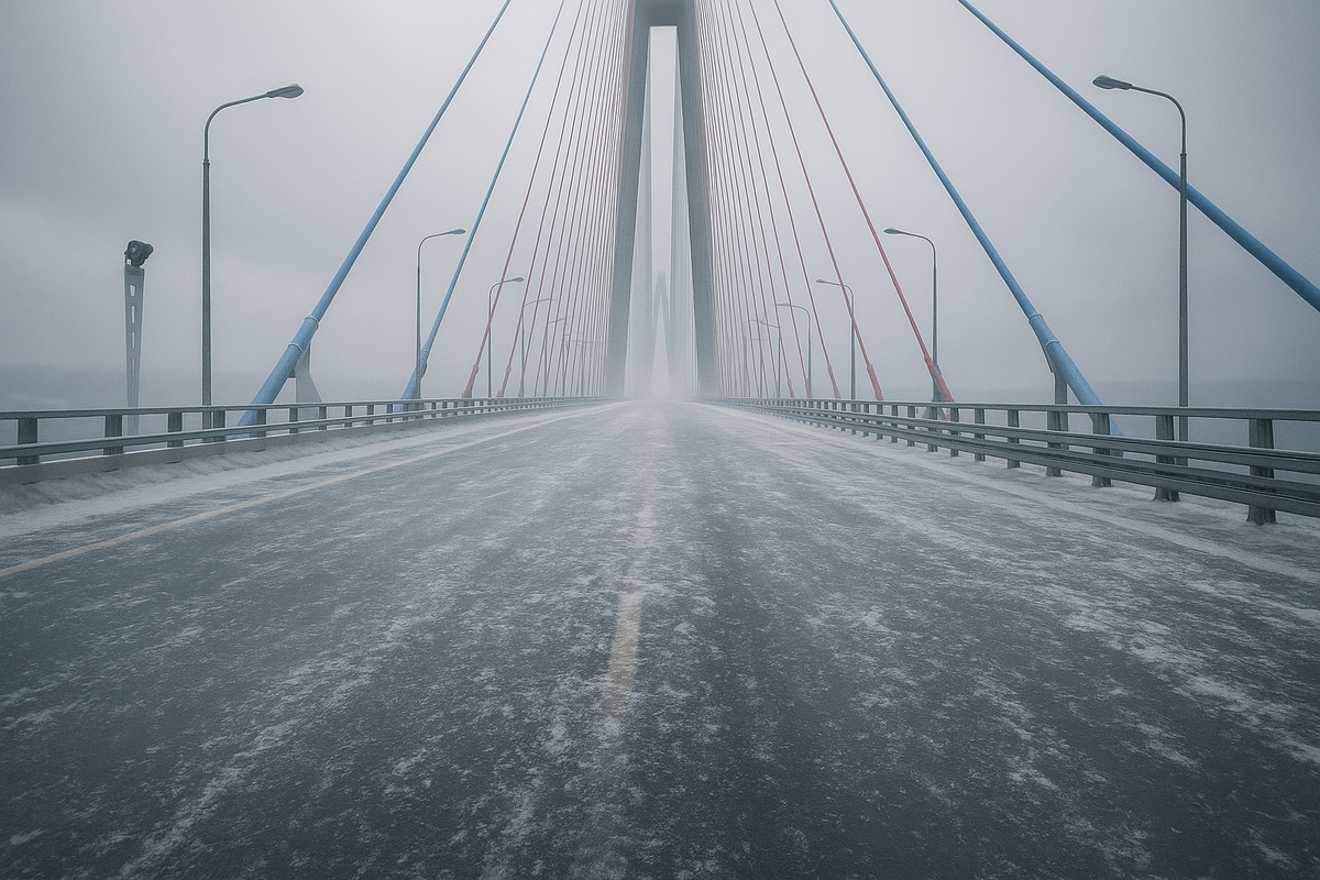 Поздней осенью и зимой водители часто замечают, что именно на мостах и эстакадах машина внезапно начинает скользить. Асфальт вроде бы сухой или просто влажный, но автомобиль теряет сцепление. Это объясняется не только качеством покрытия, но и физикой, которую невозможно обмануть. Наша компания «Уральский завод противогололедных материалов» постоянно изучает современные способы борьбы со снегом и льдом, чтобы обеспечивать безопасность на дорогах. Разберемся в месте, как избежать гололеда на мостах и эстакадах. Главная особенность мостов и эстакад — воздух вокруг них циркулирует со всех сторон. Если дорога на земле прогревается от тепла почвы, то у мостового полотна такой «подушки» нет. Ветер охлаждает покрытие сверху, снизу и сбоку. В результате температура асфальта на мосту на несколько градусов ниже, чем на соседней дороге. Когда воздух опускается к нулю, на проезжей части еще может быть плюсовая температура, а вот на мосту — уже минус. Влага, которая не успела испариться, кристаллизу