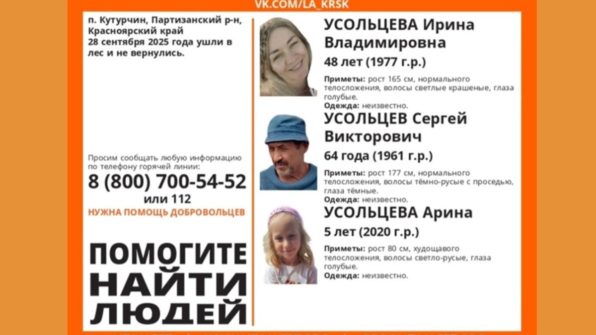Усольцевы вместе с пятилетней дочкой Ариной пропали во время похода в Беловодье 28 сентября. Были развёрнуты масштабные поиски, но до сих пор найти их не удалось.