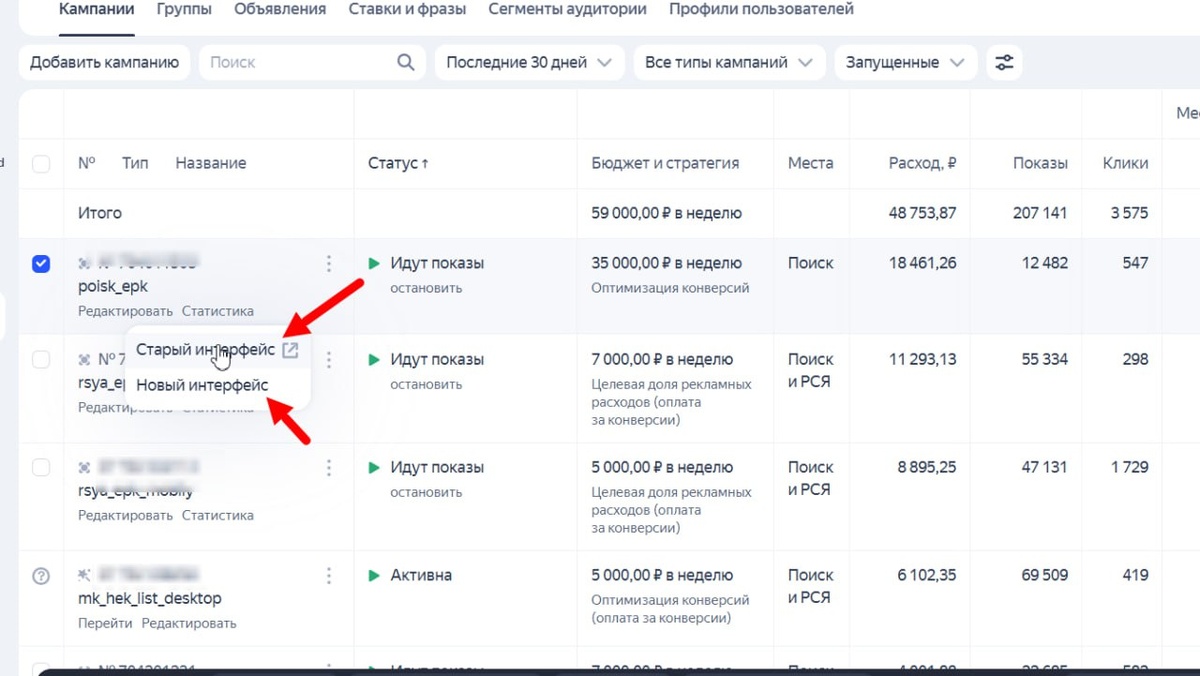 Нововведения подкатили, выбираем на главной в срезах по кампаниях тот мастер отчетов, который отвечает вашим требованиям Теперь при выборе где смотреть статистику можно выбирать старый или новый мастер отчетов, что удобно. Кто то привык уже в новом работать, а кто не хочет что то менять и предпочитает в старом. Я обычно комбо формат в обоих работаю. В старом есть то, что нет в новом, например в новом нет возможности из статистики поисковых запросов, добавлять кл.слова в кампании.