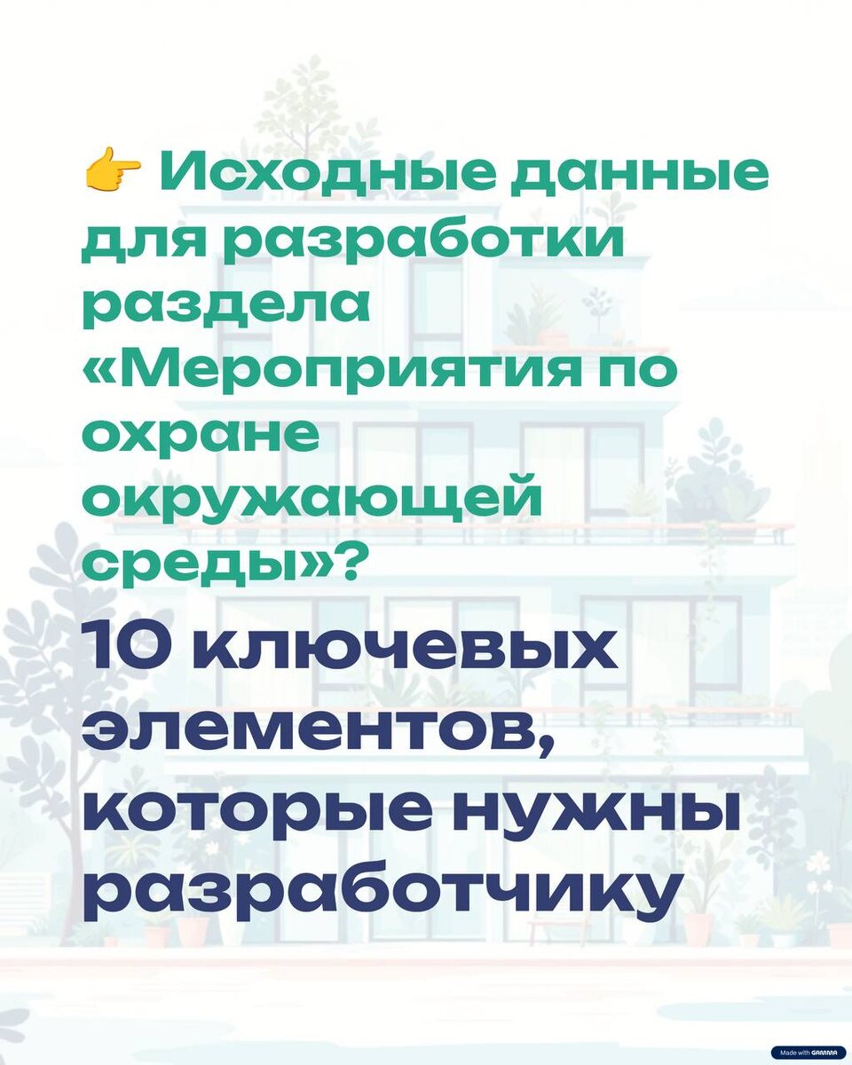 Исходные данные для разработки раздела «Мероприятия по охране окружающей среды». 1️⃣ Оформление (обложка, титул, ПЗ, штамп, состав проекта). 2️⃣ Общая ИРД: ➡️ Инженерно-экологические изыскания (характеристика уровня химического загрязнения грунтов, характеристика уровня биологического загрязнения грунтов, характеристика уровня радиологического загрязнения грунтов, биотестирование грунта); ➡️ Технические условия (водосток, водоканал, тепло, электрика); ➡️ Справка о фоновых концентрациях и климатических характеристиках; ➡️ Справка об интенсивности дорожного движения (включая железнодорожный транспорт – при наличии); ➡️ Перечетная ведомость зеленых насаждений (а если есть, то и раздел «Дендроплан»); 3️⃣ Раздел СПОЗУ: ➡️ Ситуационный план (М 1:2000 с включением ближайшей жилой зоны); ➡️ Генеральный план (М 1:500); ➡️ Благоустройство и озеленение территории (с ассортиментной таблицей высаживаемых пород, с указанием общей площади участка, площади застройки, площади отмосток, площади про