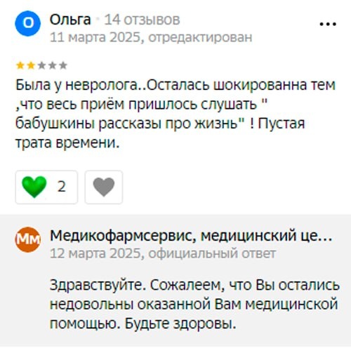 А так первичный приём невролога в «Медикофармсервисе» стоит 2,1 тыс. рублей (большинство отзывов в «2ГИС», посвящённых неврологам клиники, отрицательные, но есть и несколько положительных).