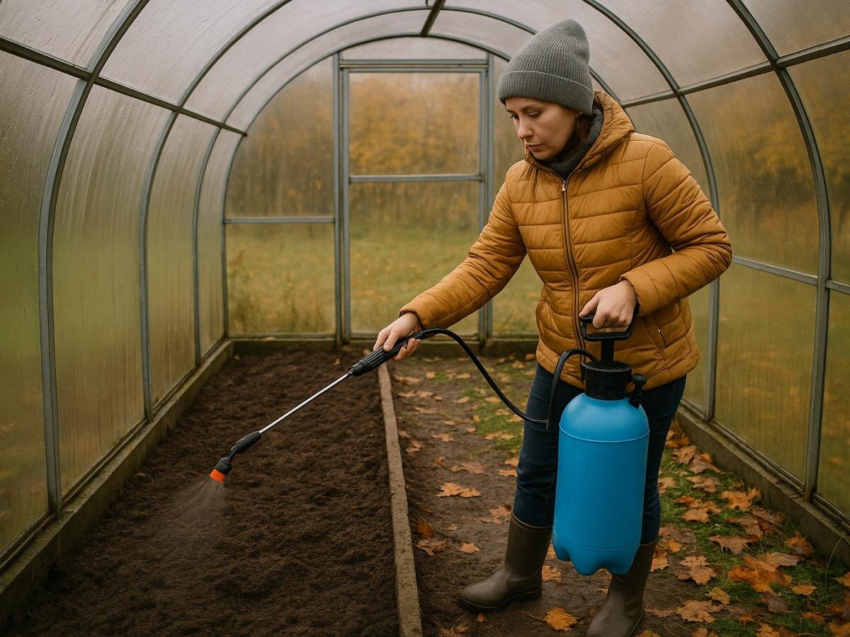 Если температура в теплице опустилась ниже +5 °C, растворы могут действовать слабее. В этом случае землю стоит перекопать, добавить золу или известь для снижения кислотности и закрыть плёнкой. Весной можно провести ускоренную биологическую обработку.