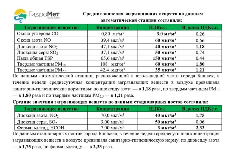 Бишкекте 24-30-октябрь 2025-жылдары абадагы негизги булгоочу заттардын ченемдик деңгээлдери 2,33 эсе жогорулады. Бул аба сапатына терс таасирин тийгизип, ден соолукка зыян келтириши мүмкүн, айрыкча балдарга, карыларга жана дем алуу органдарында хроникалык оорусу бар адамдарга. 🌫️ Бишкекте абанын сапаты начарлап жатат. 📊 2025-жылдын 24-30-октябры аралыгында Бишкекте атмосфералык абадагы негизги булгануу заттардын ченемдик деңгээлдери 2,33 эсеге жогорулаганы байкалган. 🔍 Кыргызгидромет мекемеси абанын сапатын текшерүү үчүн стационардык байкоо постторунда мониторинг жүргүзүп, чаң, азот диоксиди, күкүрт диоксиди, углерод оксиди жана башка заттардын деңгээлдерин өлчөйт. ⚠️ Бул ПДКнын ашып кетиши, жашоочулардын, айрыкча балдардын, кары адамдардын жана респиратордук оорулары бар адамдардын ден соолугуна терс таасирин тийгизиши мүмкүн. 🏥 Жергиликтүү бийлик жана адистер бул маселеге көңүл буруп, абанын сапатын жакшыртуу үчүн чараларды көрүүгө чакырат.