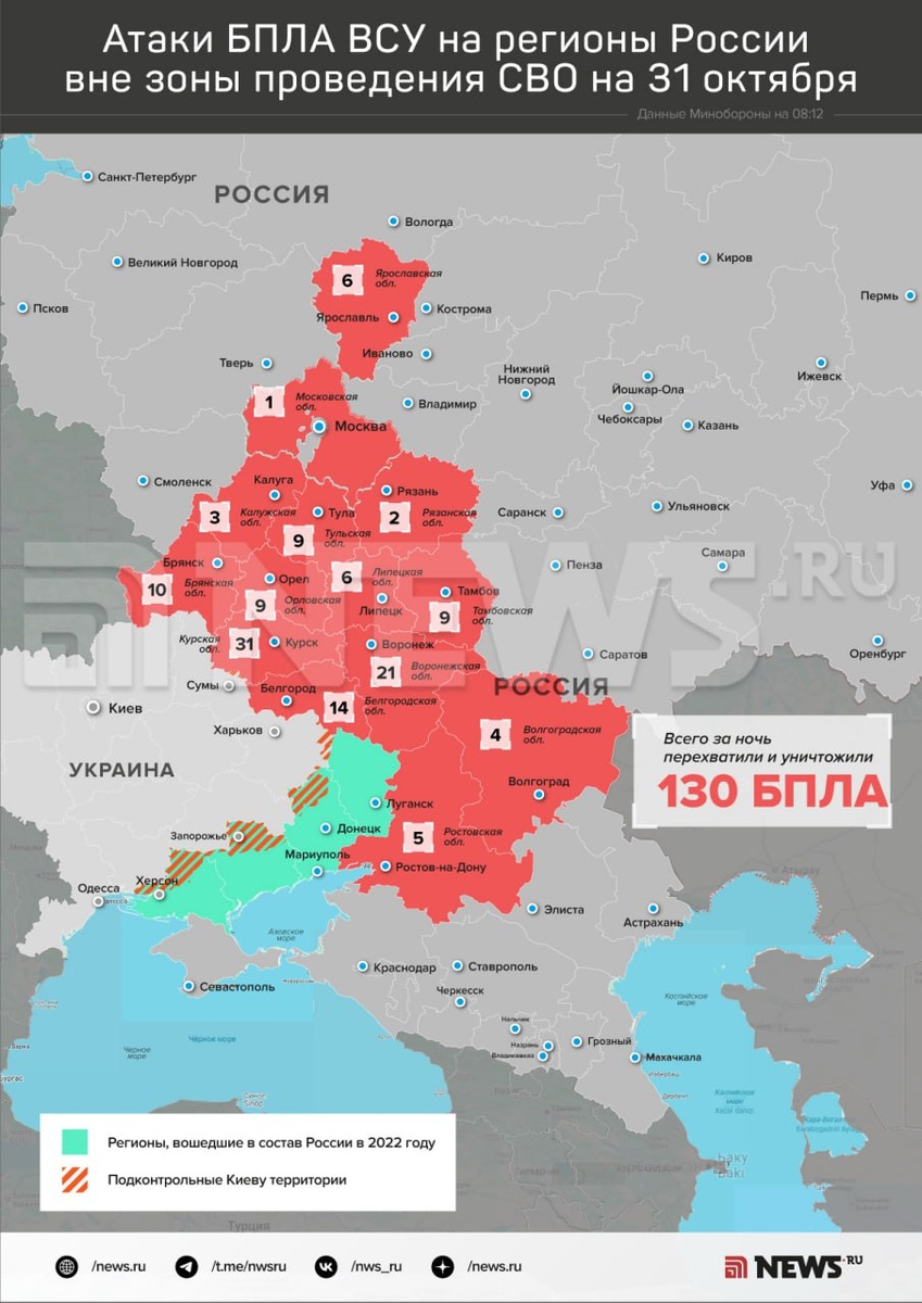 31 из них уничтожили над Курской областью, 21 — над Воронежской и еще 14 — над Белгородской областью. В каких регионах также сбили дроны — узнаете из инфографики.