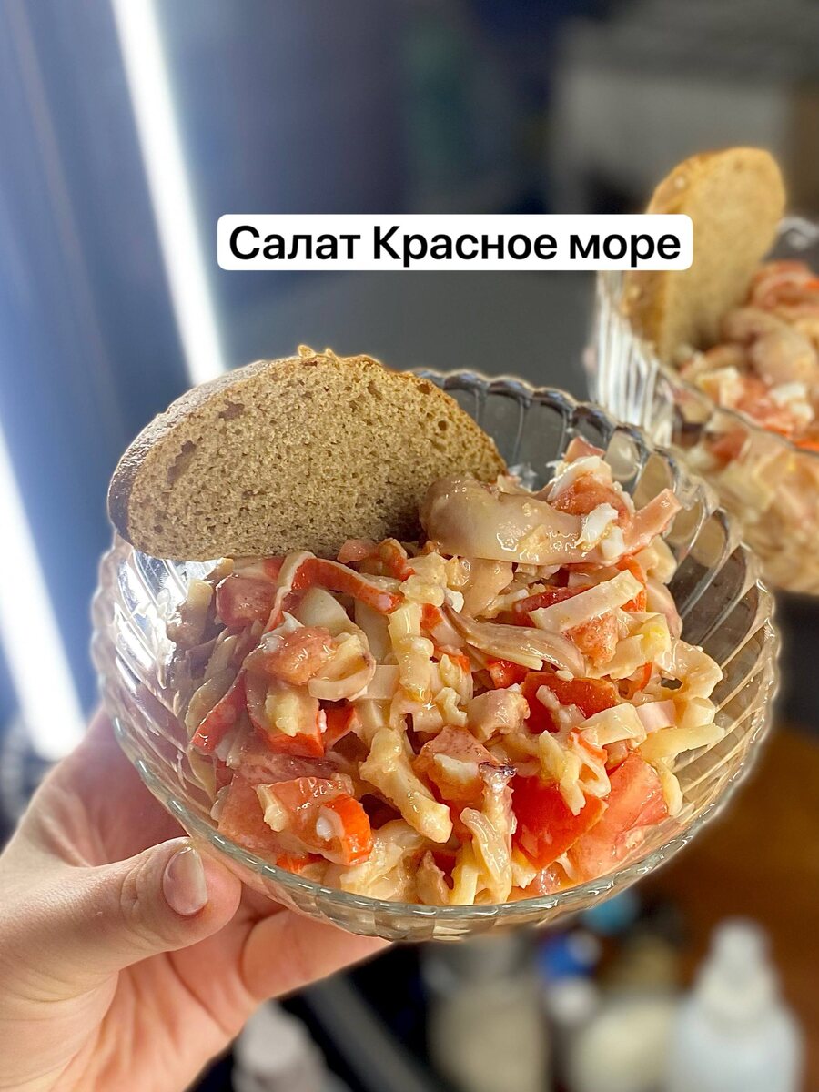 Я часто готовлю то, что можно легко найти в интернете. Вот только добавляю свои изюминки. Тут- это кальмар! (кальмар, краб палочки, сыр и помидор- всего примерно по 200гр) Потребуется: сыр, краб палочки, кальмар, болгарский перец, томат, майонез, чеснок, перец красный и паприка 1️⃣крабовые палочки порезать или поделить на волокна 2️⃣томат порезать кусками примерно по 1см, перец болгарский очень мелко и совсем немного 3️⃣натереть сыр на крупной терке, выдавить 1 небольшой зубчик чеснока 4️⃣кальмар очистить и порезать на полукольца (или купить уже подготовленный, как у меня) 5️⃣небольшой зубчик чеснока выдавить на раскаленную с маслом сковороду, добавить паприку и красный острый перец. Отправить в эту смесь кальмар на 2 мин. Жарить на сильном огне 6️⃣смешать все ингредиенты с майонезом и наслаждаться (по желанию можно добавить 1 яйцо)
