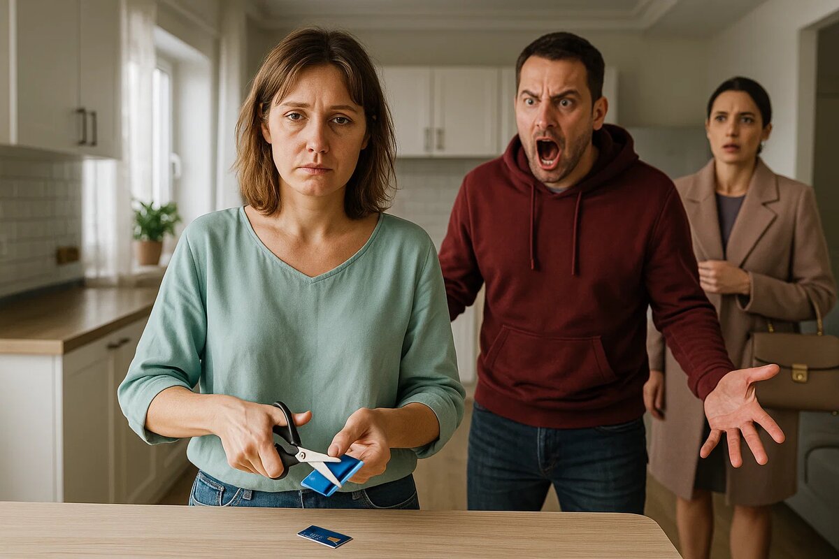 Марина прошла мимо него на кухню, достала из ящика ножницы. Вернулась, взяла его визитницу и вытащила свою карту — заблокированную, мёртвую. Разрезала пополам. Ножницы хрустнули — раз, два. Половинки упали на пол.