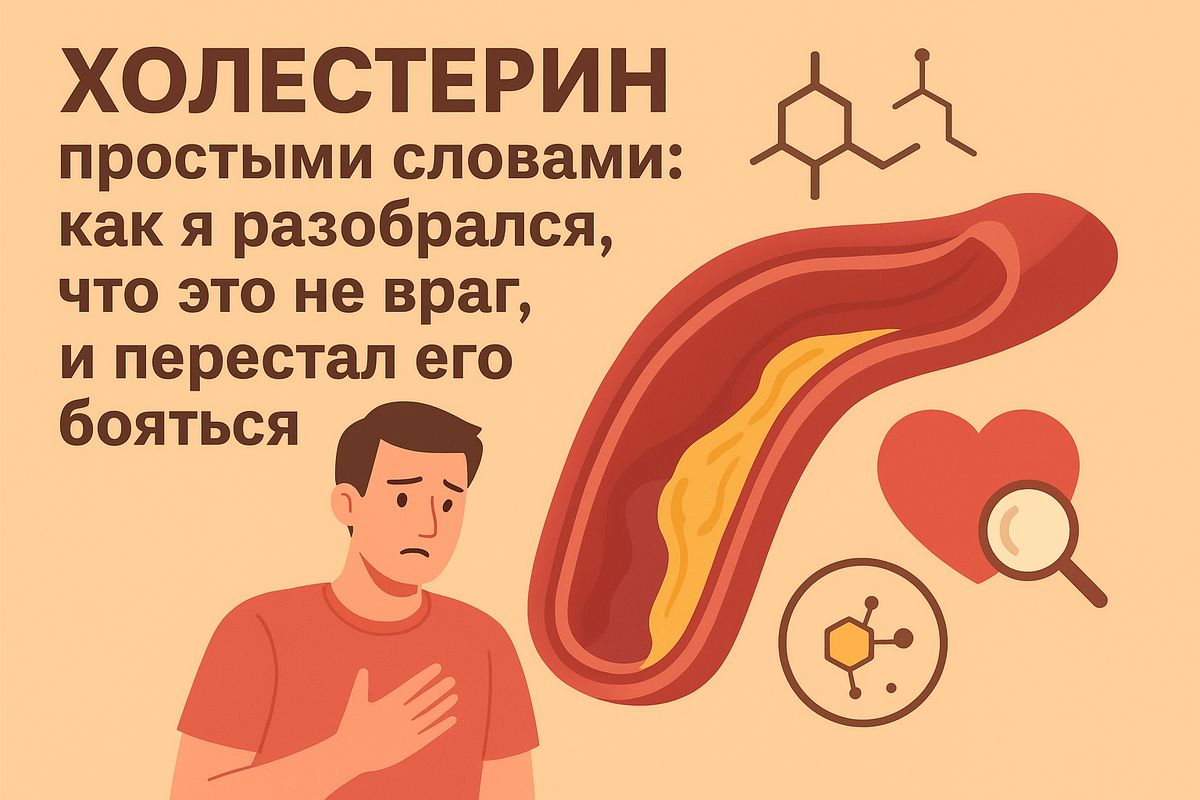 Я долго думал, что холестерин — это прям зло. Что если он повышен, то всё, считай, дорога прямая к инфаркту. Когда увидел свои анализы с высоким уровнем, в груди стало неприятно. Больше всего это было похоже на ощущение: «Ну всё… приехали». В голове сразу: «Всё, сосуды забиты, нужно срочно что-то делать…» И чем больше я гуглил, тем страшнее становилось. В интернете полно крайностей: либо «холестерин — абсолютное зло», либо «ничего не делайте, живите спокойно». Мне понадобилось время, чтобы разобраться своими словами — без научных лекций и без паники. И вот что я понял. Делюсь этим опытом для тех, кто хочет разобраться проще и без страха. Холестерин — это не яд. Это часть нас Холестерин в крови — это не что-то чужое. Он сам вырабатывается в печени, потому что он жизненно нужен организму. Он отвечает за: Без холестерина мы бы физически не могли жить. Поэтому идея «полностью убрать холестерин» — это то же самое, что пытаться жить без кислорода. Тогда почему говорят “плох