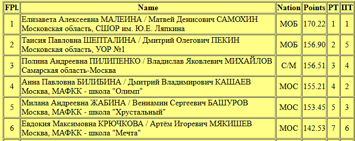 Группа Филиппа Тарасова продолжает собирать "медальный урожай" юниорских этапов Гран-при. Число наград достигло уже цифры 6. На этот раз весь пьедестал оказался "хрустальным". Впрочем, бронзовые призеры Ольга Сабада/Павел Астахов (166.38 - 3 место🥉) никак не могут быть довольны своими выступлениями, а ведь в сентябре они опередили самих Шешелеву/Карнаухова. В короткой программе ошибся Павел, а в произвольной очень много претензий прежде все самой к себе у Оли - два падения и бабочка на трех прыжковых элементах. Пермяки Даша Самохвалова/Роман Романычев (163.51 - 4 место) вполне могли стать третьими, но их потянули вниз компоненты и парные элементы.