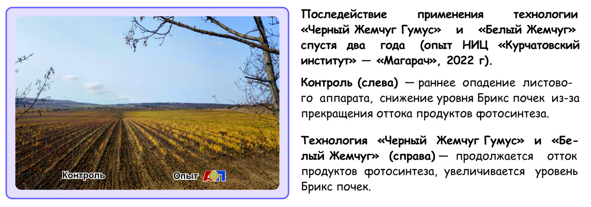 Погодные изменения и природные катаклизмы, почвенная и воздушная засуха, перепады температур в последние годы сильно снижают урожайность виноградных насаждений, ухудшается качество ягод (непланомерное ускоренное созревание при интенсивной солнечной инсоляции приводит к нарушению баланса кислот, сахаров и фенолов), при сильной засухе происходит увядание и усыхание ягод, снижается качество виноматериала. Ученые НИЦ «Курчатовский институт» — «Магарач» подбирают пути решения задач по предотвращению потерь урожайности, повышению качества ягод винограда и виноматериала, продлению продуктивного периода виноградных насаждений. Система "Черный Жемчуг Гумус" + линия "Белый Жемчуг «направлена на работу с почвой и растением Последействие применения технологии “Черный Жемчуг Гумус” и «Белый Жемчуг» спустя два года (опыт ФГБУН «ВННИИВИВ «МАГАРАЧ» РАН», 2022 г). Контроль (слева) — раннее опадение листового аппарата, снижение уровня Брикс почек из-за прекращения оттока продуктов фотосинтеза. Технологи