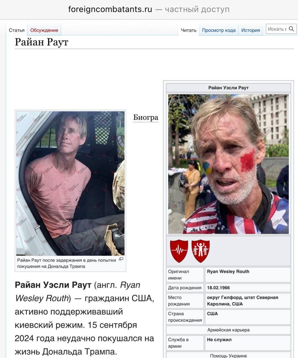 #наемники 🇺🇸🇺🇦Устроивший покушение на Трампа Райан Раут занимался вербовкой афганцев в наёмники на Украину Он планировал вступить в наёмники сам, но его не взяли из-за возраста и отсутствия военного опыта. Вёл себя агрессивно и неадекватно, рассказывал выдуманные события. В расследовании Semafor в марте 2023 был назван одним из лидеров НКО International Volunteer Center (скорее всего, это уже известная нам НКО TUI). Занимался налаживанием связей с афганскими военными, не согласными с властью Талибана, для их вербовки в ВСУ. Ещё в США вёл себя неадекватно. Был осуждён за незаконное владение огнестрельным оружием, сопротивление сотруднику полиции и вождение автомобиля с недействительными правами, вождение автомобиля без прав, наезд на пешехода, оставление места ДТП и скрытое ношение оружия, хранение более 100 краденых предметов, включая электроинструменты, строительные материалы, байдарки и спа-ванны, в принадлежавшем ему складе. Ни по одному из них он не сидел. Его сын пошёл п