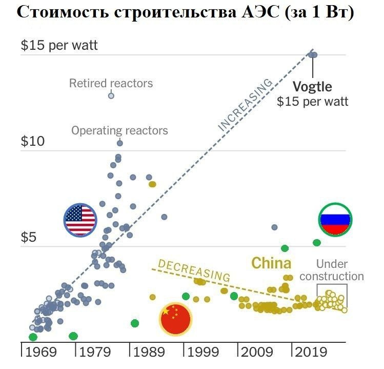 У атомщиков нашёл интересное сравнение стоимости строительства АЭС китайцами и США. Китайцы (что ожидаемо) разносят амеров - средняя стоимость стройки за 1 Вт $1,2 против $8. Добавил на график статистику по Росатому (зелёные точки) - мы очень даже хорошо смотрится на фоне Китая - $1,3 за Вт. Правда, как только мы выходим за рубеж, то цена вырастает до $5-$6 (на графике две правые зелёные точки - турецкая АЭС и казахстанская АЭС)