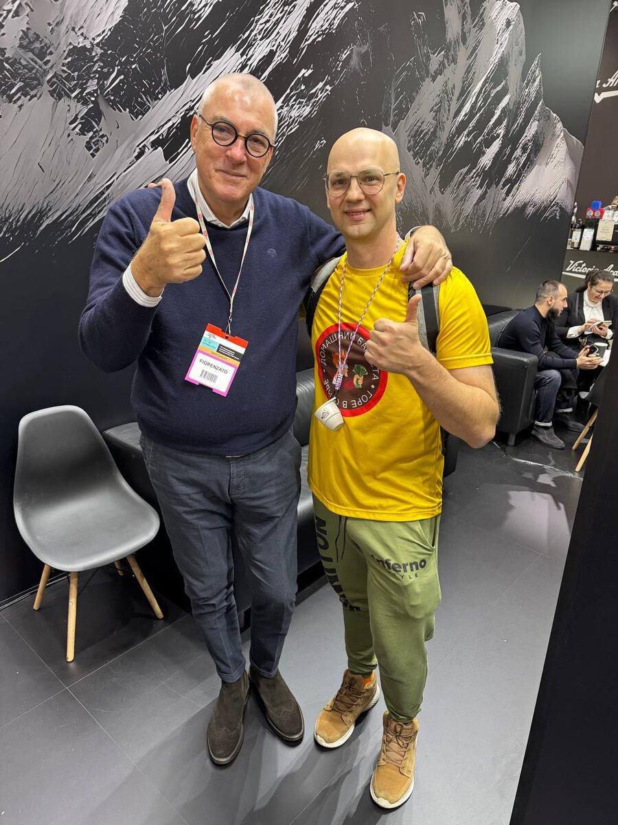 ✴️ Главные итоги ПИРа Пьетручка поехала в Италию! Мне удалось пообщаться с Карло – директором по продажам Fiorenzato и заинтересовать его своим аксессуаром. Мы классно поболтали. Я задал парочку вопросов и узнал некоторые "инсайды". Я спросил, почему у жерновов убрали покрытие Dark-T. Он ответил, что покрытие увеличивало стоимость, а ресурс в несколько тонн не нужен на ручной кофемолке. Ещё я спросил про будущее Пьетры. Будет ли электрическая версия Пьетры, вторая версия или какие-то новые аксессуары? Он ответил, что в конце следующего года планируют выпустить электрическую базу, чтобы смалывать на Пьетре автоматически. Больше никаких подробностей, но зато я, а теперь и вы, узнали об этом самыми первыми! Я спросил, знает ли он дизайнера Валерио Кометти. Карло ответил, что знает, это их дизайнер. Потом я показал свою Пьетручку, и Карло рассмеялся: "Валерио скажет, что ты убил его дизайн" 😁. Он сделал фотки Пьетручки, поснимал как она работает. А я подарил Пьетручку, чтобы в Fiore