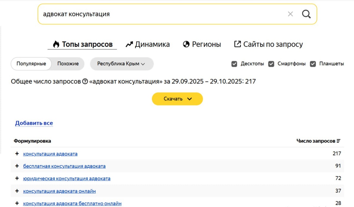 Получили заказ от адвоката. Запрос такой - как потратить тысяч 10 - 15, чтобы получить несколько квалифицированных лидов и хотя бы одного клиента. Клиенты на уголовные дела. Задача нетривиальная, - все давно знают, что адвокат - это рекомендация. Адвокат хоть изрекламируется, но клиентов больше не становится. От нас — оценка рынка, оценка услуги, путь клиента, выбор площадки, лидогенерация. Обработка заявок не нужна — потому что адвокатская тайна и дорого. Рынок Чтобы Вы понимали запрос на консультацию адвоката в 25 раз меньше чем на юриста. Когда человек ищет адвоката, предполагается именно уголовный адвокат. По региону на 1,5 млн человек, всего 200 человек в месяц ищут консультацию. Из них половина ищут бесплатно и онлайн. Судебная статистика дает 2,5 тысячи дел в год, то есть 200 в месяц. Но есть еще доследственные проверки, адвокат для потерпевших, адвокат для того чтобы разобраться в будущем и так далее.