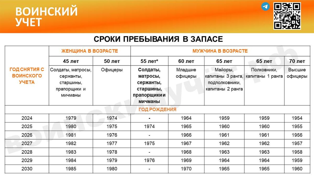 Кто попал под повышение с 1.01.2024 г.: Рядовой состав - солдаты, матросы, сержанты, старшины, прапорщики и мичманы. Офицеры запаса и дамы с ВБ могут вздохнуть: их возраст пребывания в запасе остался неизменным. Все о военкоматах и воинском учете С 2024 по 2028 год действует переходный период Призывникам, главное, сразу возраст призыва подняли...до 30 лет, без всяких переходных периодов... 📌 Личная явка в военкомат для снятия с ВУ не требуется Основание ПП № 719 от 27.11.2006: «Об утверждении Положения о воинском учете»: 1️⃣ Автоматизированный учет Согласно пункту 16(1) Положения, снятие с ВУ осуществляется путем внесения сведений в Реестр ВУ. 2️⃣ Отсутствие такой обязанности В разделе IX «Обязанности граждан по воинскому учету» (пункт 50) перечислены обязанности граждан по ВУ. 📌 Обязанности самостоятельно являться для снятия с учета по достижении предельного возраста в этом перечне нет. Что, конечно же, не устраивает ряд ВК, которые требуют личной явки наших сотрудников для снятия и