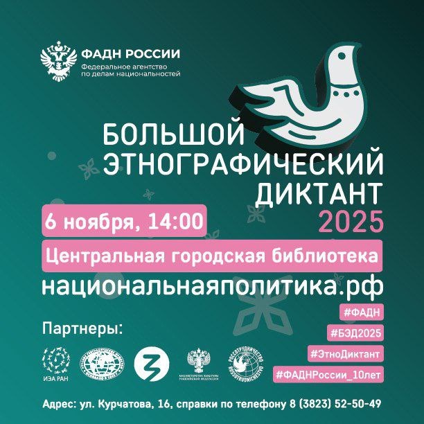 Северчан приглашают принять участие в этнографическом диктанте С 1 по 8 ноября 2025 года во всех субъектах Российской Федерации и зарубежных странах пройдет Юбилейная X Всероссийская просветительская акция «Большой этнографический диктант». Что ждет участников? - Увлекательный тест: для ребят до 16 лет – 20 вопросов, а для взрослых и мудрых – 30! - Всего 45 минут, чтобы покорить вершину в 100 баллов! - Участвовать могут все! Неважно, где вы живете, сколько вам лет и какой вы национальности – диктант для каждого. Как присоединиться? Очно: Приходите 6 ноября в 14:00 в Центральную городскую библиотеку (ул. Курчатова, 16). Регистрация с 13:00! Онлайн: на официальном сайте miretno.ru.