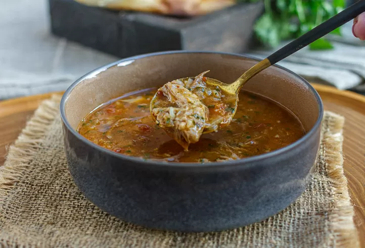 8. За 5 минут до завершения готовки добавьте в суп нарезанное мясо, молотый кориандр и уцхо-сунели.