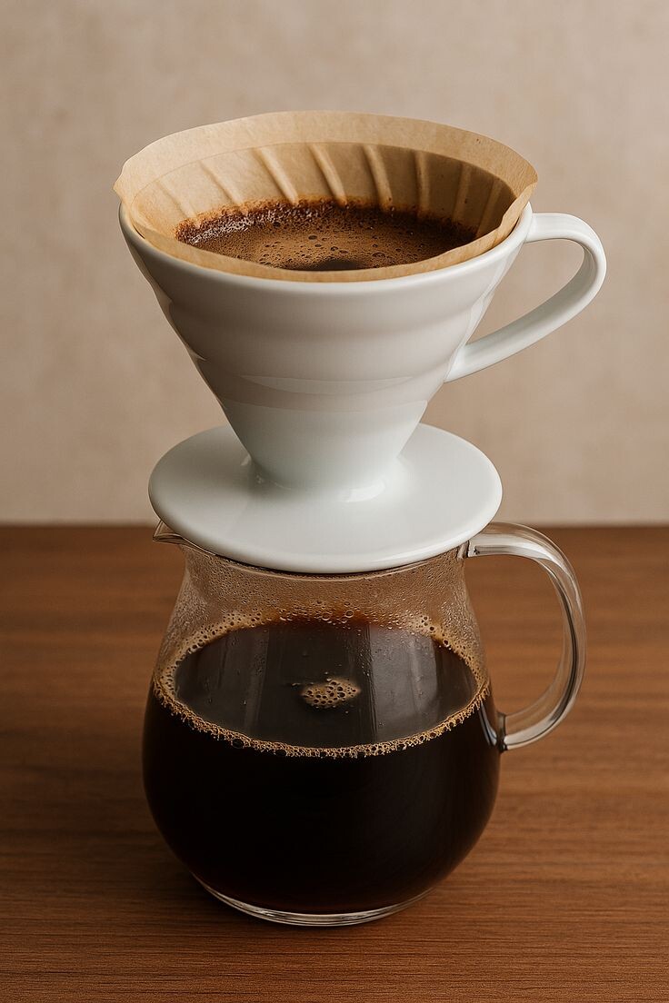 Без давления и лишней техники — только вода и зерно, чтобы вкус раскрылся сам. Горячая вода медленно проходит через слой молотого кофе в бумажном фильтре и стекает внизу уже в виде готового кофе. Способы заваривания: V60 (пуровер), Кемекс или даже простые домашние воронки.