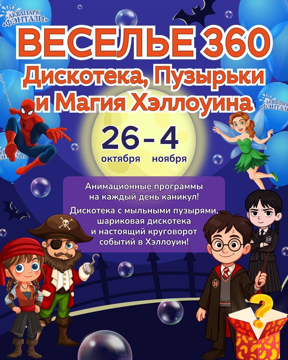 Веселье 360: Дискотека, Пузырьки и Магия Хэллоуина в аквапарке «Фэнтази» в @aquafentazi! Напоминалка: в каникулы БЕСПЛАТНЫЕ мероприятия в нашем аквапарке проходят каждый день! А ещё добавили новые даты — 2, 3 и 4 ноября. Не пропустите — будет интересно! ✨ 🔵 31 октября: Хэллоуин в аквапарке с Гарри Поттером и Уэнсдей 🔵 2 ноября: Шариковая дискотека с Человеком-пауком 🔵 3 ноября: Дискотека с мыльными пузырями с Уэнсдей 🔵 4 ноября: Шариковая дискотека с Пираткой Мероприятие проходит два раза в день, чтобы каждый смог присоединиться к празднику и зарядиться энергией на весь день. Не упустите шанс окунуться в атмосферу приключений и танцев среди пузырей и веселья! Собирайте друзей и семью и приходите в аквапарк «Веселье 360°» — эти каникулы будут незабываемыми! Подробнее ЗДЕСЬ @Together_with_kids Пост носит информационный характер Поддержать канал голосом ЗДЕСЬ