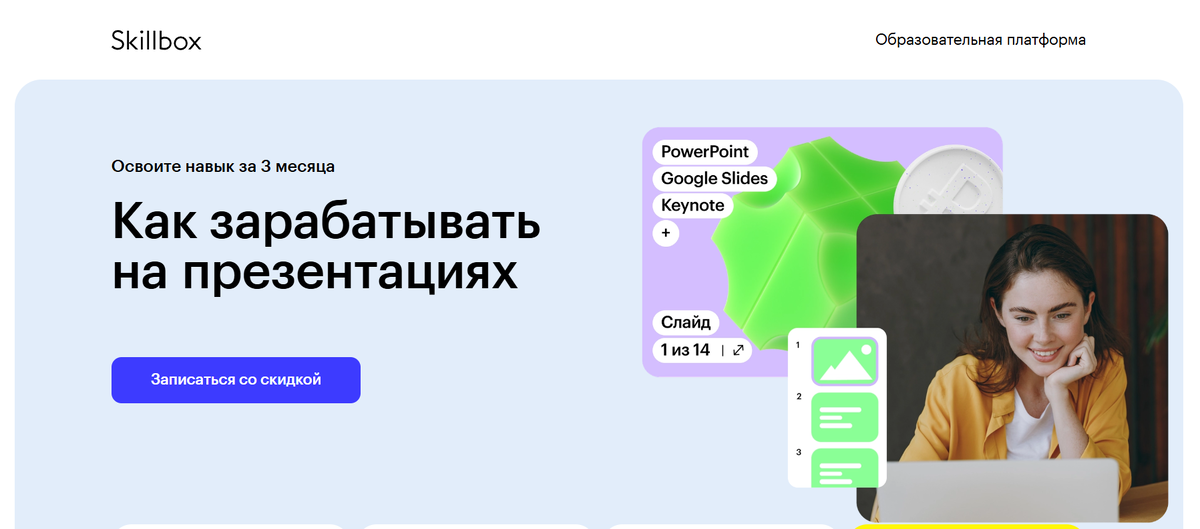 Онлайн-формат для начинающих: за 3 месяца вы научитесь делать презентации и понятную инфографику, повышать доход, работать с клиентами и продавать услуги на фриланс-биржах.