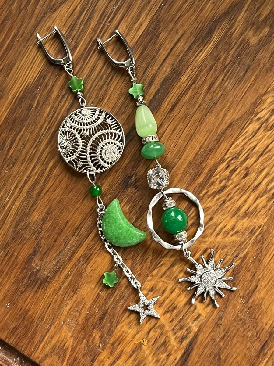 Я обожаю порядок. Но есть нюанс. 😄 Как человеку творческому мне немного трудно его соблюдать. Особенно в мастерской. Да можно, называть это: творческий беспорядок, хотя это больше смахивает на творческий беспредел) 🗝️🧸🪡🧵🧶✂️📿 Конечно, проще когда у каждой вещи есть свое место и нужно просто всё расставить. Тут главное не начинать рассматривать) ⚙️ Про зелёненькие серьги В эти серьгах всё точно на своих местах, хотя и творческий беспорядок присутствует) Агаты, солнце и месяц, и дзинь. Длинные. Подробнее как всегда в сторис)