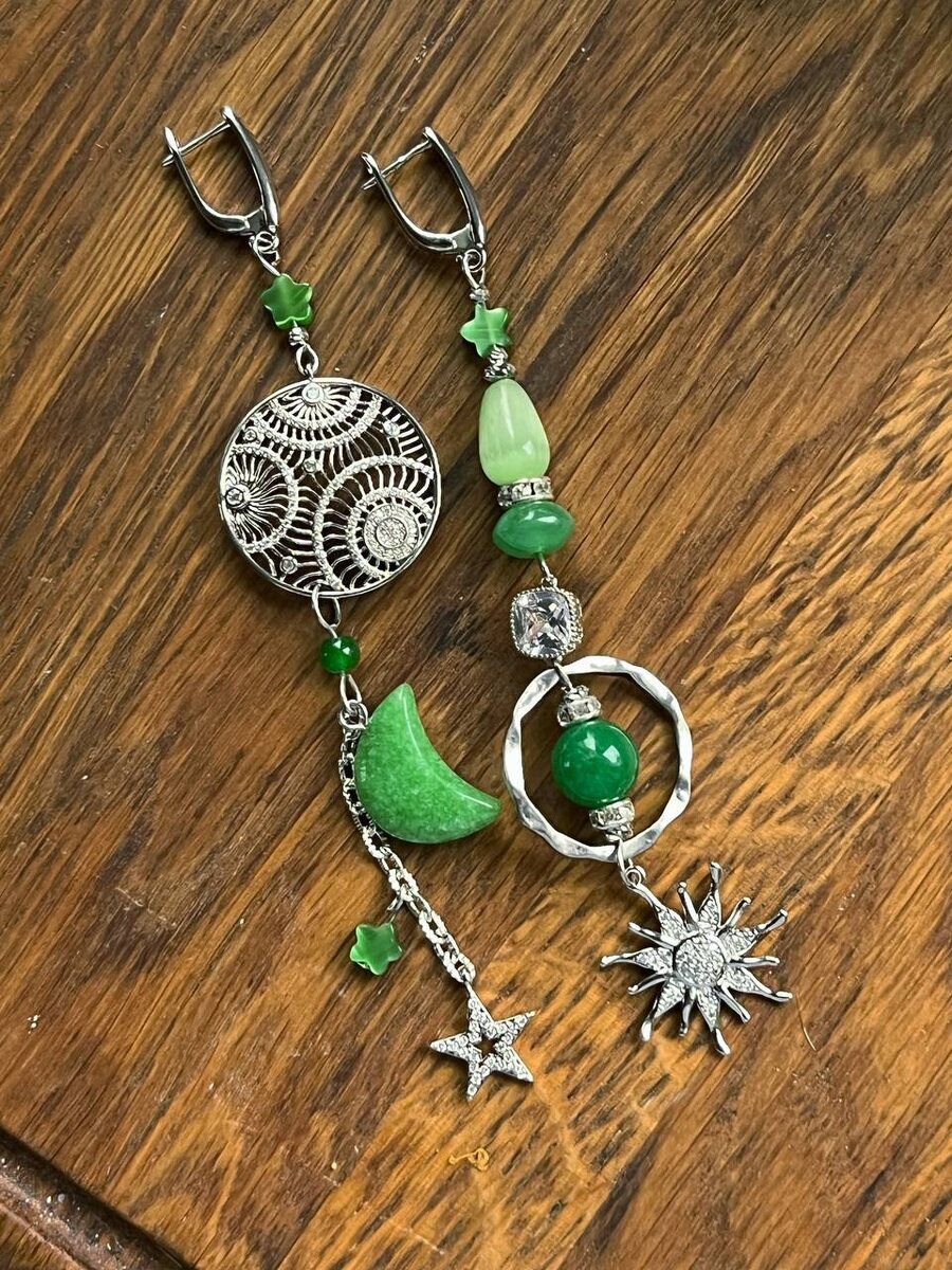 Я обожаю порядок. Но есть нюанс. 😄 Как человеку творческому мне немного трудно его соблюдать. Особенно в мастерской. Да можно, называть это: творческий беспорядок, хотя это больше смахивает на творческий беспредел) 🗝️🧸🪡🧵🧶✂️📿 Конечно, проще когда у каждой вещи есть свое место и нужно просто всё расставить. Тут главное не начинать рассматривать) ⚙️ Про зелёненькие серьги В эти серьгах всё точно на своих местах, хотя и творческий беспорядок присутствует) Агаты, солнце и месяц, и дзинь. Длинные. Подробнее как всегда в сторис)