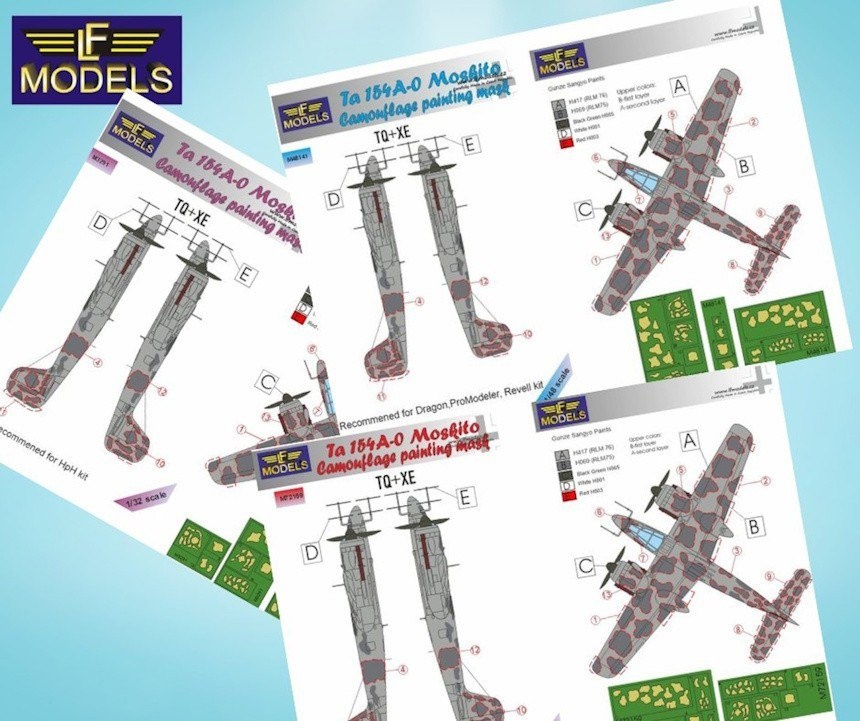 LF Models из Чехии выпустила окрасочные маски для моделей Ta 154A-0 Moskito в масштабах 1/72 (от Hasegawa и Pioneer 2), 1/48 (Dragon, Promodeler, Revell) и 1/32 (HpH). 1/72 M72159 - Ta 154A-0 Moskito Camouflage Painting Mask M72160 - Ta 154V-1 Camouflage Painting Mask 1/48 M48141 - Ta 154A-0 Moskito Camouflage Painting Mask M48142 - Ta 154V-1 Camouflage Painting Mask 1/32 M3291 - Ta 154A-0 Camouflage Painting Mask M3292 - Ta 154V-1 Camouflage Painting Mask