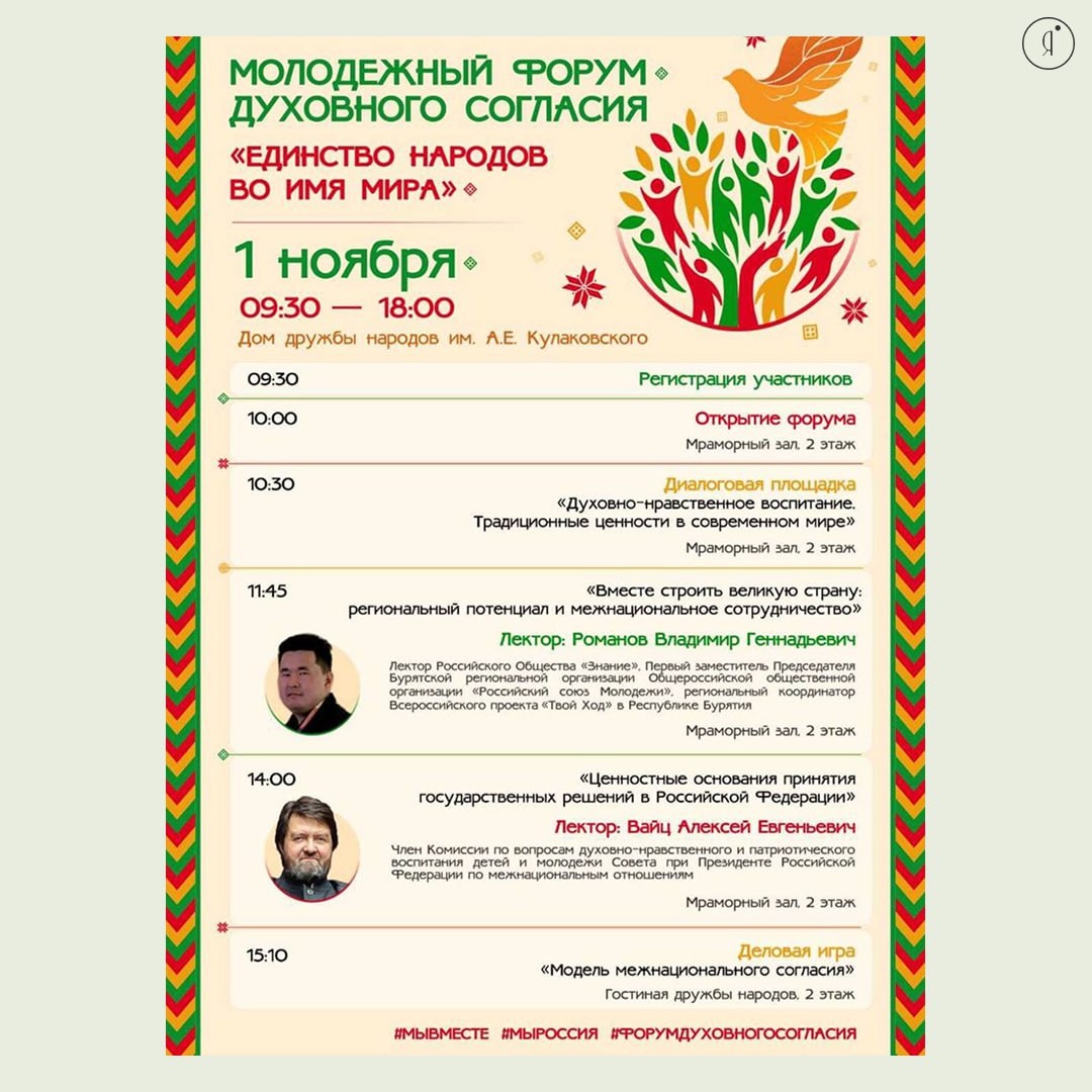 Молодёжный форум духовного согласия «Единство народов во имя мира» #ВГороде Программа дня: 10:00 — Торжественное открытие с участием почётных гостей. 10:30 — Диалоговая площадка: «Традиционные ценности в современном мире». 11:45 — Лекция: «Вместе строить великую страну: региональный потенциал и межнациональное сотрудничество» (Владимир Романов). 14:00 — Лекция: «Ценностные основания принятия государственных решений в Российской Федерации» (Алексей Вайц) 15:10 — Деловая игра «Модель межнационального согласия». Кофе-паузы, живое общение и нетворкинг! На форум приглашают молодых лидеров, активистов, студентов и представителей молодёжных организаций. 1 ноября | 10:00-18:00 ДДН им. А.Е. Кулаковского, Пояркова, 4 Участие бесплатное, регистрация с 9:30 Online Якутия | Ждем вас в МАХ