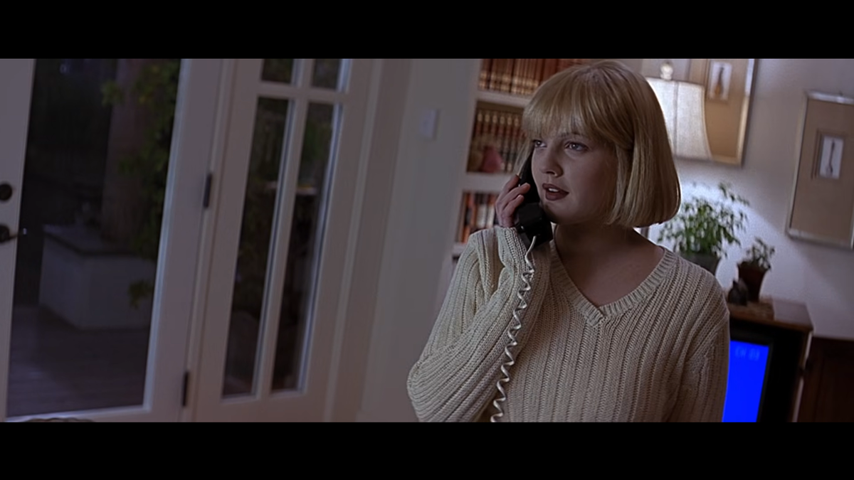 Картина открывается сценой, которая оказала влияние, пожалуй, на весь актуальный кинематограф ужасов. Слэшеры и раньше открывались кровожадной сценой убийства блондинки, но «Крик» делает это совершенно уникальным образом. В кадре появляется Дрю Берримор, чье лицо было на всем маркетинге картины, так она еще к тому времени уже была узнаваемой звездой кинематографа. Зритель, уверенный до последнего, что следит за главной героиней, был шокирован тем, что в финале продолжительного сложного эпизода девушку цинично закалывали ножом в грудь и подвешивали на дереве. Мастерский в своей продуманности эпизод содержал в себе ударную дозу саспенса, но при этом еще и удачно развлекал зрителя. Блондинка в уютном вязаном свитере успевала обсудить с убийцей любимые фильмы ужасом и сказать, что лучший «Кошмар на улице Вязов» – это только первая часть. Напряженная беседа по телефону, погоня, ужас от осознания, что неловкий флирт перерос в настоящую угрозу – все эти элементы создают один из лучших слэшерных эпизодов за всю историю кинематографа.