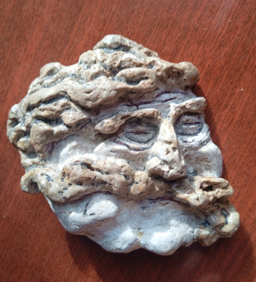 Однажды я нашел удивительный камешек. Конечно, это был он и только он - сэр Джон Фальстаф, персонаж пьесы Шекспира “Король Генрих 4”. В бугристой поверхности камешка угадывалось расплывшееся лицо. После несложной доработки на нем появились маленькие с хитрым прищуром глазки. Добавьте к этому хорошее сочетание густых бровей и просто шикарных усов. Редеющая шевелюра очень удачно дополнила образ уже немолодого гуляки. Многочисленные бугорки, создающие его мясистые лицо, также хорошо работали на образ. Для большей выразительности я покрыл его гусарские усы и редеющие волосенки на голове масляным лаком. Хотя был соблазн покрыть лаком все его мясистое лицо… Вот цитата о нашем герое из книги “Шекспировский экран” А. Липкова (М., Искусство, 1975): “... обрюзгший, заплывший жиром толстяк, позабывший когда в последний раз видел собственные колени, бурдюк прибауток, бомба, начиненная враньем, этот завсегдатай трактиров, бардаков и всех иных непотребных мест, только и умеющий что бражничать, пох