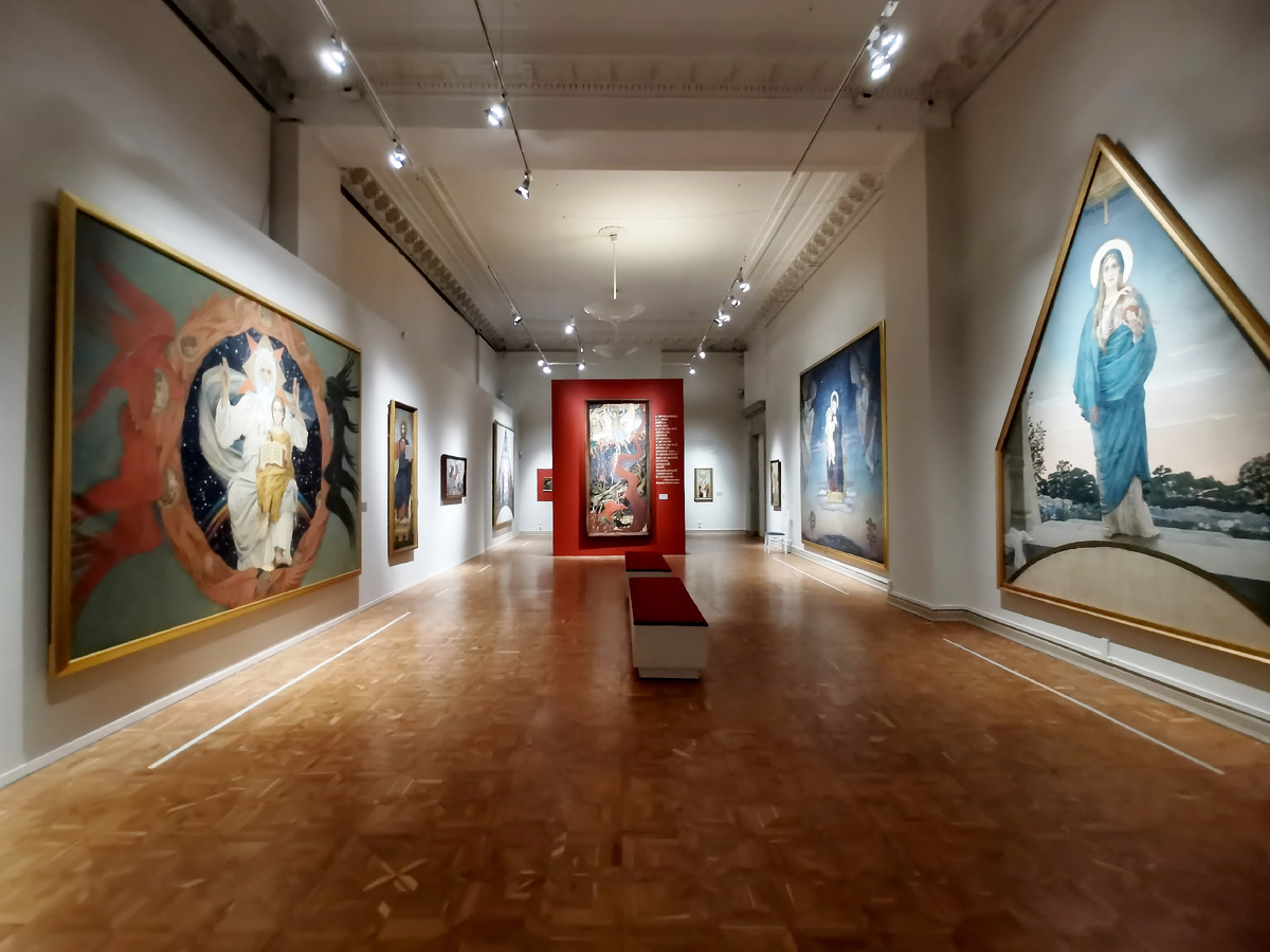 Выставка "Виктор Васнецов. К 175-летию со дня рождения" в Русском музее стала масштабным событием, представившим около 120 работ мастера из ведущих музеев страны. Экспозиция охватила все грани творчества художника: от былинно-сказочных полотен до монументальных религиозных композиций, включая эскизы росписей и предметы декоративно-прикладного искусства. Особое внимание на выставке было уделено религиозному творчеству Васнецова, которое он считал своим главным делом. Художник стремился возродить духовное начало в церковной живописи, соединив каноны иконописи с достижениями реалистической школы и фольклорной теплотой. Его работы в этом жанре отличались эмоциональностью и национальным колоритом, что сделало их значимым вкладом в русскую религиозную живопись.