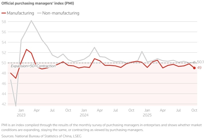 Официальный индекс менеджеров по закупкам (PMI) упал до 49,0 в октябре с 49,8 в сентябре, что является шестимесячным минимумом, показал опрос Национального бюро статистики в пятницу, 31 октября, оставаясь ниже отметки 50, отделяющей рост от спада.